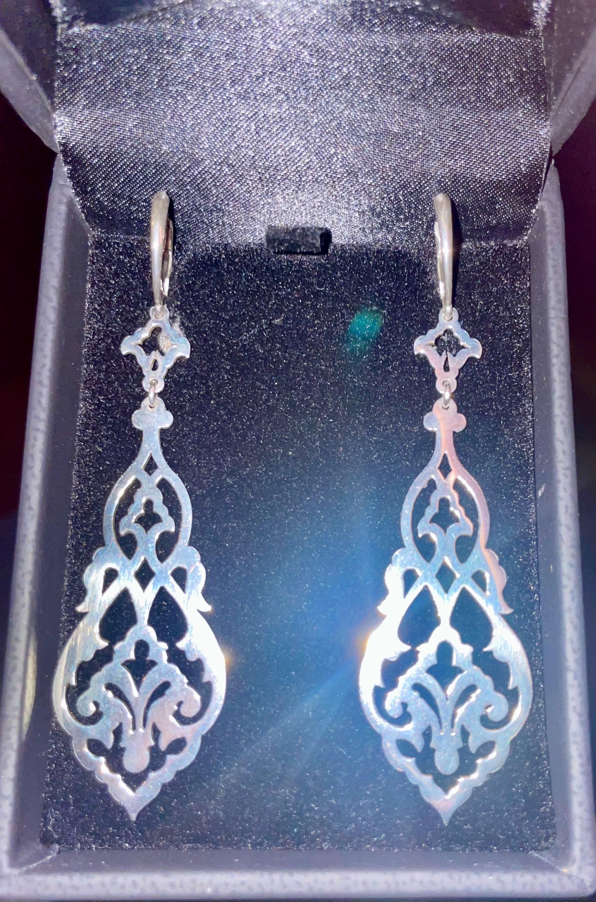 These elegantly intricate earrings are completely hand cut from sheets of sterling silver and hang from solid sterling silver lever back earrings. They are surprisingly light to wear and dangle elegantly showing different angles as you move while casting beautiful shadows onto your neck.