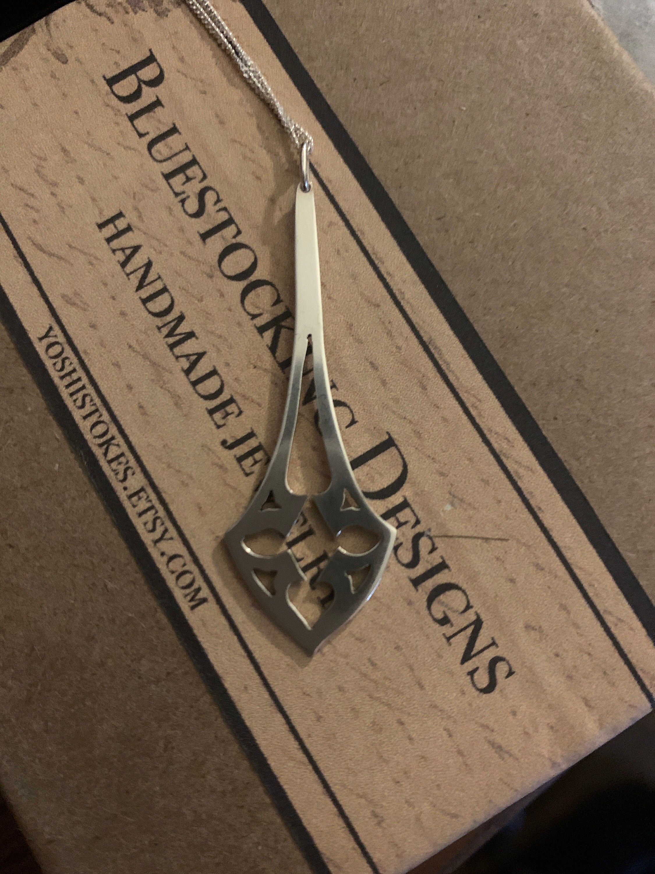 Inspired by Gothic architecture, particularly the stonework of windows and archways, and influenced by the revival of the Gothic aesthetic during the Victorian age, this graceful necklace is hand cut from sheets of sterling silver and comes with a solid sterling silver chain of your choice. The pendant itself measures 1.75 inches long.